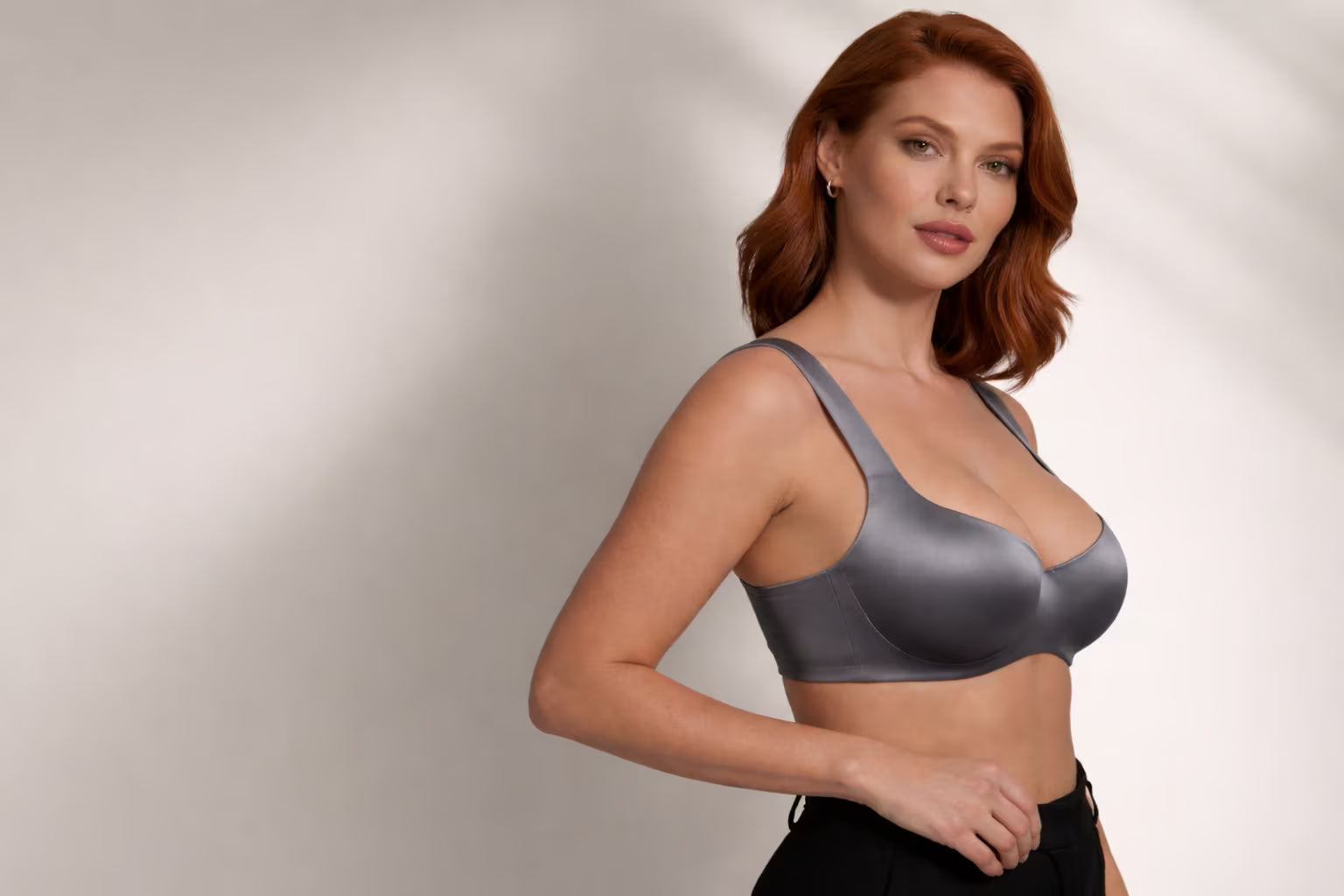 Research highlights three defining traits of implants versus natural breasts — a rounder (semi spherical) shape, firmer (less malleable) texture, and greater forward protection. Traditional bras were never designed for augmented anatomy. Shallow cups, rigid wires that rise too high, and top overflow all contribute to discomfort and misaligned fit.